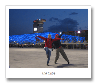 Between the shopping we went to the Olympic park where all the main buildings constructed for the 2008 Olympics reside.  The park is a vast, gray, concrete park with a few impressive highlights.  First of course is the Bird’s Nest or the Beijing National Stadium – an unconventional, beautiful building that surely catches the eye.  Next to the Bird’s Nest is the equally impressive Cube, especially after dark, where Phelps won eight gold medals during the Olympics.  The other buildings in the park were just huge piles of concrete, steel and glass.