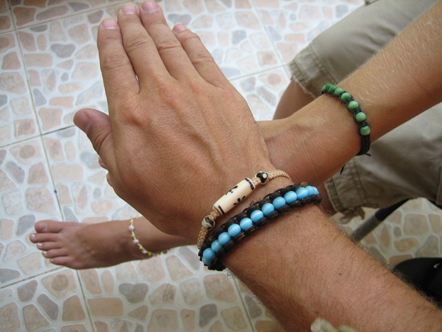 As I wrote before, we have been under-blinged during the first part of the trip.  This has felt uncomfortable and people have been looking at us like we just landed in Thailand.  Finally we have made the minimum of two bracelets each, I have two on my wrist plus one necklace and Elínborg has one on the wrist and another one on her ankle.  Now we can finally blend into the seasoned farángs (foreigners) in Thailand.