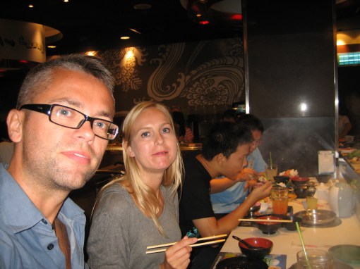 Last night we went out to a Shabu Shabu and sushi place for Easter dinner. Shabu Shabu is a Japanese style hot pot where you get a thin soup but can add all sorts of stuff to it – just the way you like it. They had meat, herbs, noodles, squid, fish and a lot of other unidentifiable stuff. The sushi was also good and I think we have not eaten as much the whole trip.
