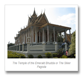 After the National Museum we headed across the street to see the Royal Palace. Admission was a whopping $6 per person – we were hesitant but went in anyway (yes, we’ve gotten so cheap by now :). There were only two buildings that were available to us, the coronation room and The Silver Pagoda. The Silver Pagoda is famous for the 500 kg of silver that decorate the floor of the temple and the two Buddha statues, first a 90 kg solid gold man-sized statue decorated with over 2,000 diamonds and a smaller a small 17th century baccarat crystal Buddha. The buildings were nice but we felt that there was something lacking – it seemed like they were trying to make the numbers rather then creating a balanced and beautiful space. Unfortunately photography was not allowed in those two buildings.